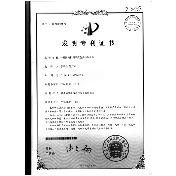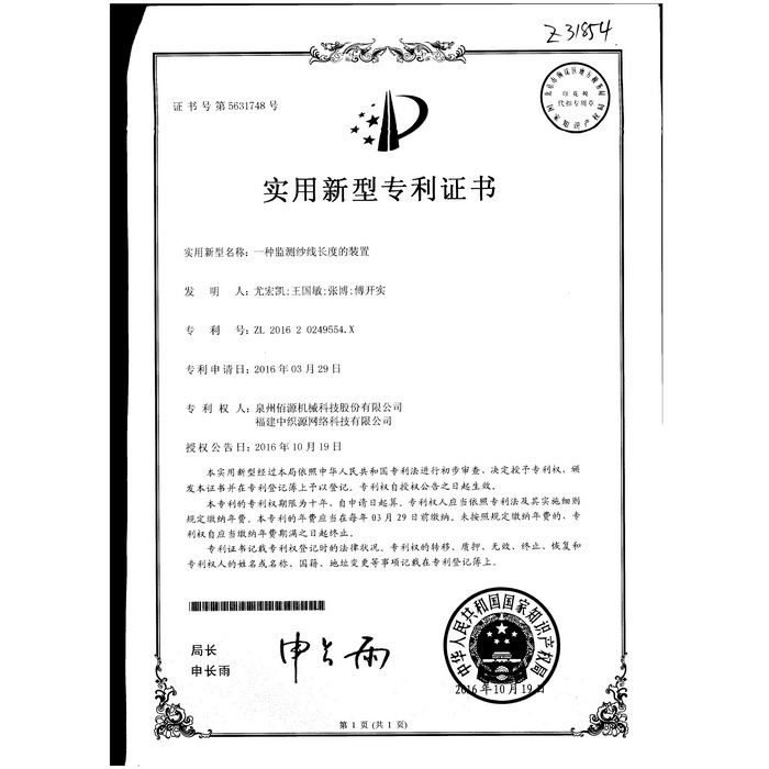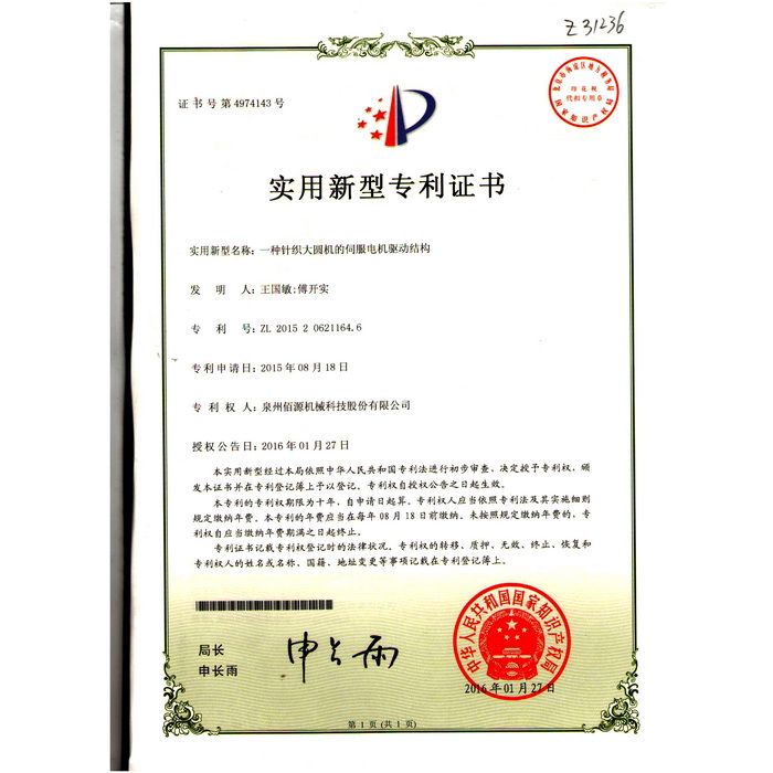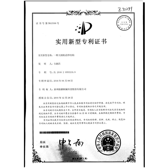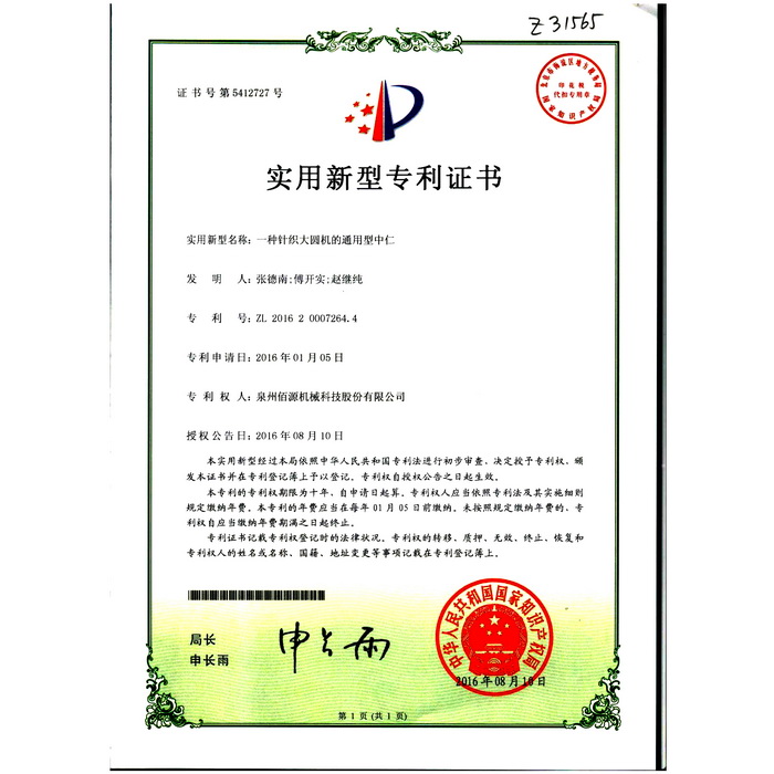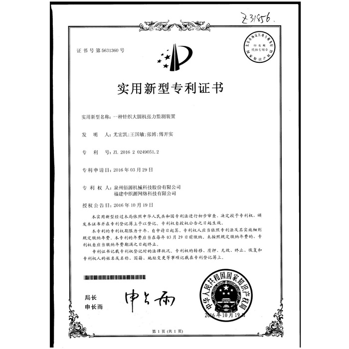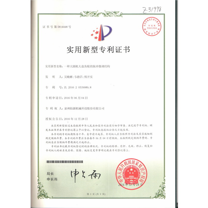 新型-泉州佰源機械科技股份有限公司 一種大圓機大盤齒輪的脈沖微調(diào)結(jié)構(gòu) 實用新型專利證書