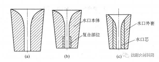 (3) 鑲嵌式定徑水口:鑲嵌式定徑水口分為外套和內芯兩部分,分別制成后用耐火泥黏結在一起;水口本體一般為高鋁材質;內芯為氧化鋯材質。這種水口的制作成本低,抗熱震性好,氧化鋯的含量可依據不同的要求進行制作,所以產品的性價比較高,使用量較大。